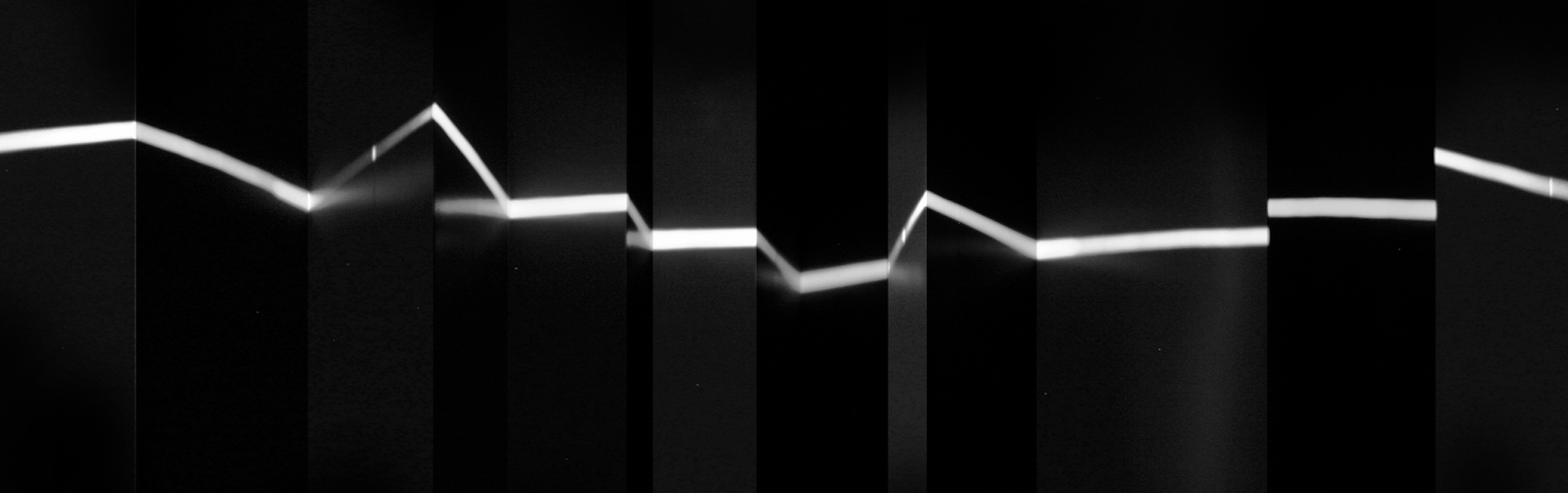 A sequence of oblique walls, ca. two meters tall, is articulated in a dark room of the gallery. A spotlight in the middle of the room projects a light beam on the panels, hitting them at different heights. The viewer is invited to an ever-changing perception of space.